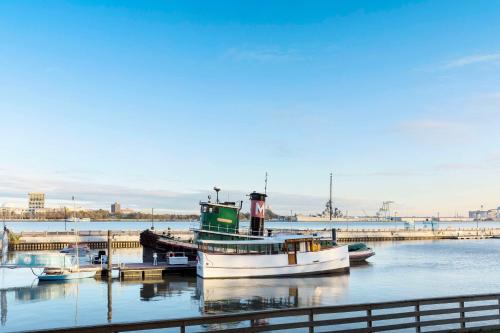 This 4-star hotel is located on the Delaware River waterfront in Philadelphia. The hotel offers an indoor pool with river views, an on-site restaurant and guest rooms with Wi-Fi. Hilton Philadelphia Penn's Landing features a 24-hour gym. Guests can use the sauna or the outdoor sundeck. Guest rooms at Hilton Philadelphia Penn's Landing are equipped with flat-screen TVs and iPod docking stations. Ergonomic work desks and designer bath amenities are also included. Keating's Rope & Anchor Bar + Kitchen serves American cuisine for breakfast, lunch and dinner. Pastries, muffins and Starbucks coffees are offered in the hotel's cafe. The hotel is located in the Historic Penn's Landing neighborhood. Adventure Aquarium is a 10-minute drive away. Center City is located 1.4 mi away and Philadelphia's Historic sites are within 0.6 mi walk.