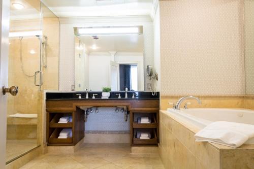 There was no fan in the bathroom. Sinks were too small, hard to rinse face off without hitting the faucet or getting water all over the floor, and the towels could be fluffier.